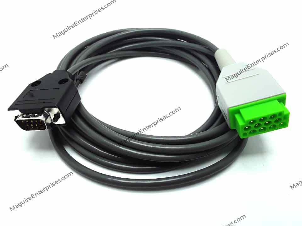 ECG cable. DB9 output of GE Case 8000, T2100 or Max 1 Stress Tester treadmill to all GE monitors and select ultrasound models Vivid 5, 7, E9, E95 and Logiq Series, 11 pin patient ECG input.